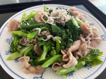 ①菜の花は葉っぱをちぎり茎は斜め切り